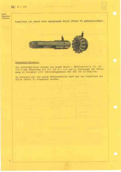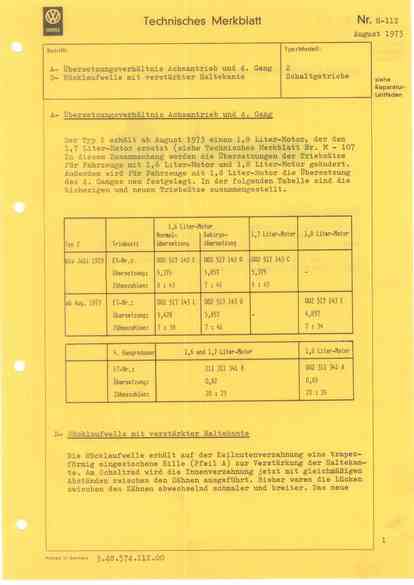 Übersetzungsverhältnis Achsantrieb und 4. Gang / Rücklaufwelle mit verstärkter Haltekante - 2 Schaltgetriebe - August 1973