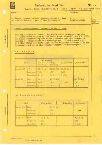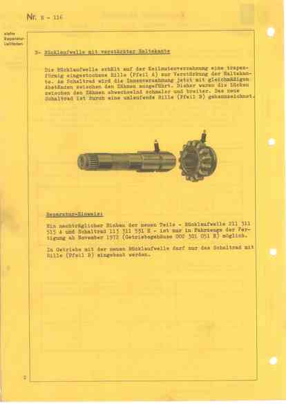 Übersetzungsverhältnis Achsantrieb und 4. Gang / Rücklaufwelle mit verstärkter Haltekante - 2 Schaltgetriebe - September 1973