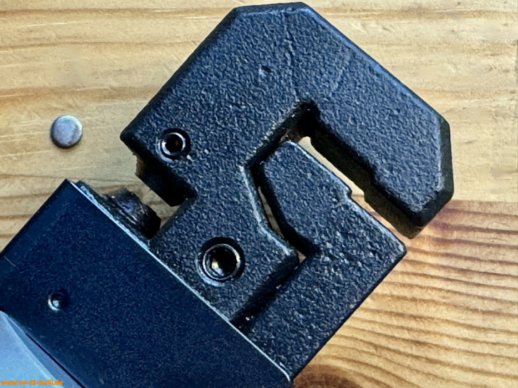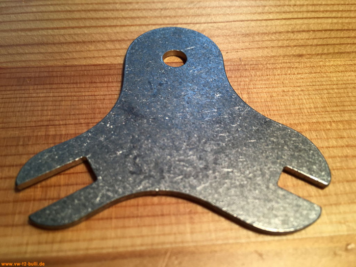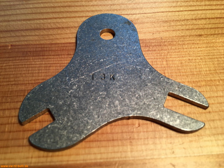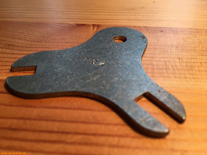 Dient am Armaturenbrett dem Festziehen der geschlitzten Alurosette/Befestigungsmutter von Schaltern. Das Werkzeug hat eine Stärke von 2mm. Die Seite mit dem Loch dient für 12V Warnblinkschalter, die Seite mit dem spitzen Maul mit 6mm Öffnung für 6V Schalter, die andere mit 5mm Öffnung für 12V Schalter wie Lichtschalter und andere. In seiner neusten Fassung (hier nicht im Bild) auch mit Flaschenöffner-Aussparung.