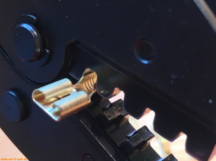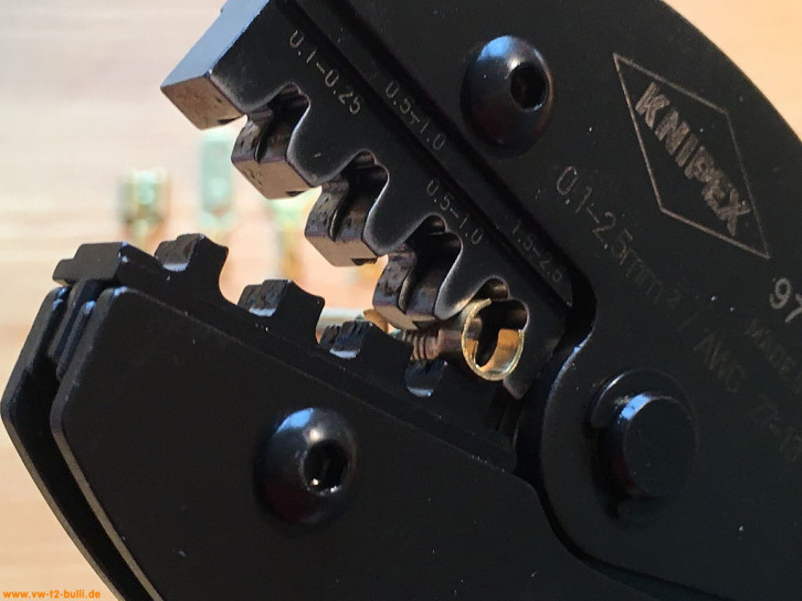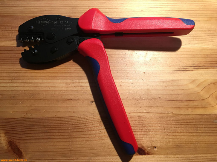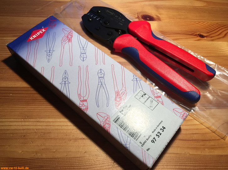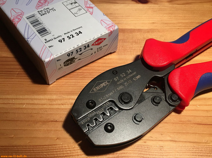 Hochwertige Crimpzange für unisolierte, offene Steckverbinder mit 2,8 und 4,8 mm Steckerbreite und Kabeln von 0,1 - 2,5 mm² wie in luftgekühlten VWs und T2 üblich. Es gibt auch die "97 52 35" für 0,5 - 6 mm², die für manchen vielleicht noch geeigneter ist.