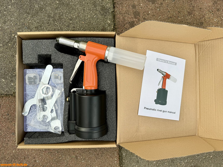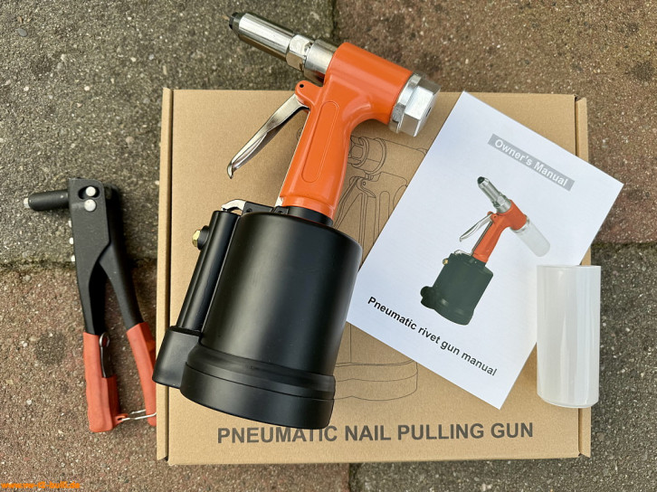 Im Bulli sind auch einige einfache Blindnieten genutzt. Z.B. für die Dämmplatten über dem Motor. Oder bei mir die Leisten für den Dachhimmel. Die billigen Nietzangen benötigen bei größeren Nieten viel Kraft und Raum um die Kraft aufzubringen. Für die Erneuerung der Dämmplatten im Motorraum bei eingebauten Motor waren meine Hände in den hintersten Ecken nicht kraftvoll genug. Also suchte ich nach eine kompakten Lösung. Elektrische Blindnietpistole sind meist recht lang in Nietrichtung und passen auf engen Raum nicht. Da ich einen Kompressor und Druckluft habe passt diese AUTOUTLET Druckluft Blindnietpistole sehr gut. Der hintere Auswurfkorb muss nicht montiert werden. Auch größere 4.8 mm Nieten sind in Millisekunden damit ohne Mühe schnell gesetzt. Sie ist mit 5 Mundstücken ausgelegt für Blindnieten von 2.4 bis 6.4 mm (Edelstahl nur bis 4,8) und im Set mit Nieten, Werkzeug, Ersatzgreifern und 500 Nieten. Nur den beiliegenden Druckluftanschluss habe ich gegen einen Deutschen Kupplungsstandard der Nennweite 7,2 mm mit 1/4" Außengewinde für diese Blindnietpistole ausgetauscht.