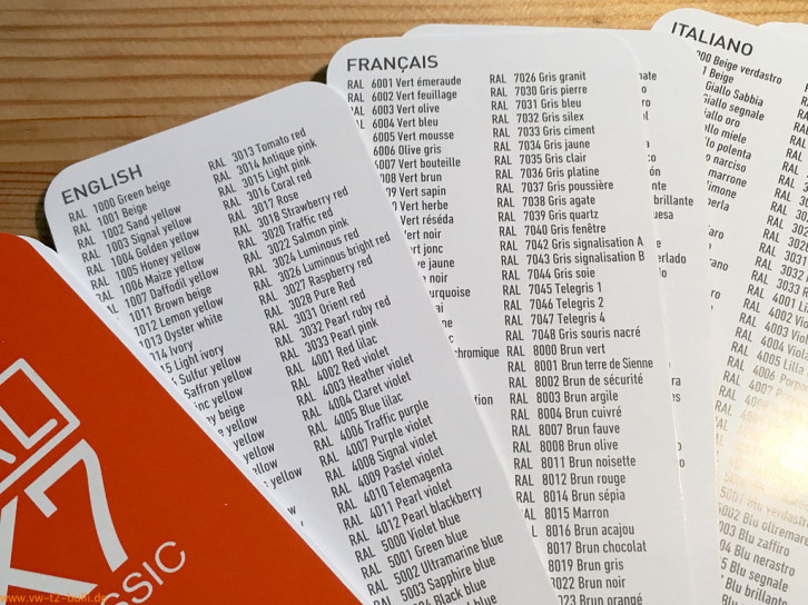 Um Farben grob zu bestimmen hilft ein Farbfächer. Aber Vorsicht: diese sind nur für Druckfarben und Autolacke sind komplexer und finden sich selten RAL Farbton. Dennoch kann man damit für viele Anbauteile den Farbton grob bestimmen um diese günstig im Farbenhandel zu finden ohne diese extra aber genauer anmischen zu lassen.
