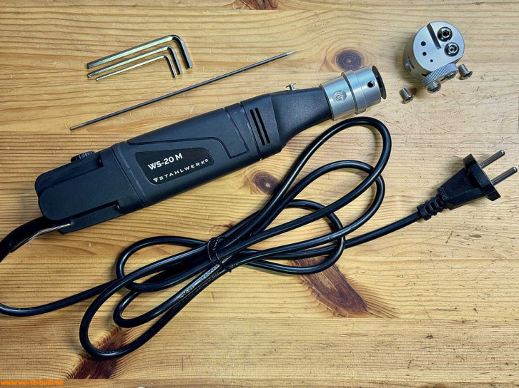 Daher habe ich dieses noch preiswerte, mobile, kabelgebundene 125 W Gerät gewählt, dass ich am Einsatzort oder vor der Garagentür nutzen kann. Der Staub wird wenig verteilt und durch das kleine Sichtfenster. Die Diamantschleifscheibe lässt sich recht schnell wechseln oder umdrehen. Der Winkel ist ab Werk 22,5°, kann aber etwas verändert werden. Es sind Einführhilfen für 1,6, 2,4 und 3,2 mm Elektroden dabei. Man kann die Spitze auch abstumpfen oder Elektroden kappen. Die Standfestigkeit der 25 mm kleinen Diamantschleifscheibe ist nicht sehr groß und man sollte genug Ersatz haben bei Projekten - ich hatte gleich ein 5 Set mitgekauft.