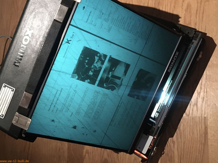 Vor den Zeiten von Computern waren viele VW Reparatur-Leitfaden und Teilekataloge auf je einem handlichen Mikrofiche, d.h. photographisch extrem verkleinert auf Mikroplanfilm. Um diese Lesen zu können, standen bei VW große später oft orange Sichtgeräte.