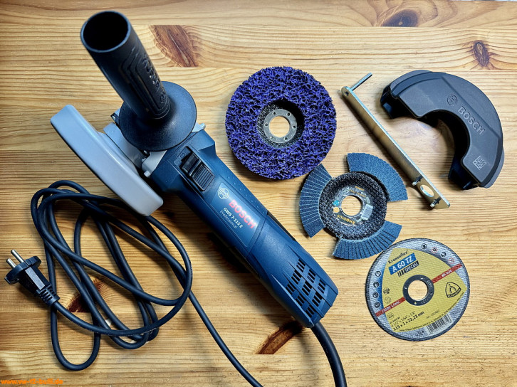 Dieses handlich und kleine, 1,9 kg schwere Winkelschleifer für 115 mm Scheibendurchmesser mit 720 W und einstellbaren 2.800–11.000 Umdrehungen pro min dient mir zum Reinigen, Entrosten und Schleifen.