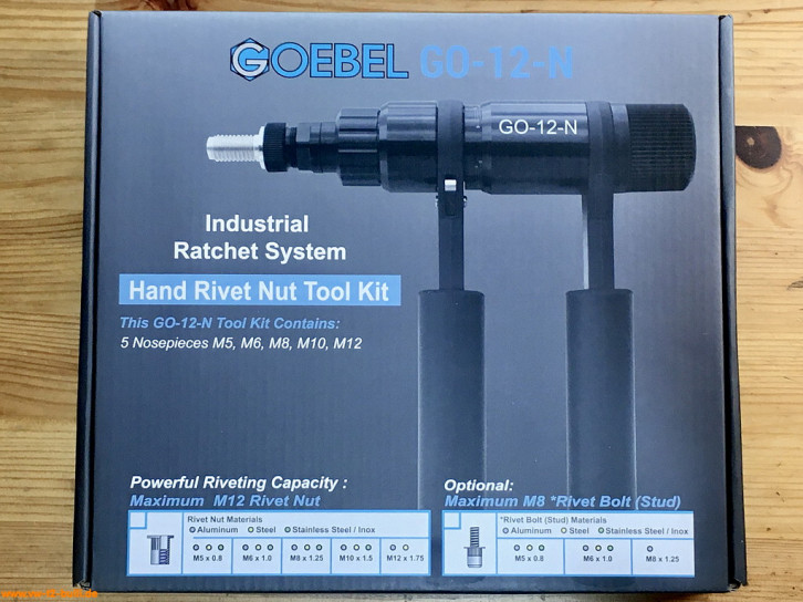 Zum Innenausbau eines Campers braucht man oft zusätzliche Befestigungsmöglichkeiten. Oft auch dort, wo man von der Gegenseite nicht herankommt für einer Gegenverschaubung. Dafür eignen sich Blindnietmuttern und Blindnietschrauben. Es gibt dfür unterschiedliches Werkzeug. Teil recht günstige Lösungen mit zwei zusammenzuführenden Armen über der Vernietung, welche dann aber Kraft und viel Raum bedürfen. Oder eine Ratschen Lösung die auch Stück für Stück mit wenig Kraft und weniger Raum auskommt wie die von mir genutzte GOEBEL GO-12-N, die ich auch in Ecken des Motorraums oder in der Reserveradwanne noch nutzen konnte. Sie eignet sich für M3 bis M12 Blindnietmuttern (im Standardset enthalten nur M5 bis M12, weiteres hinzugekauft) und M5 bis M8 Blindnietschrauben. Ich hab vorwiegend (aber nicht nur) mit M8 Edelstahl Blindnietmuttern gearbeitet.