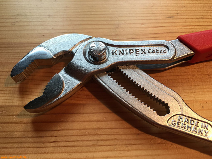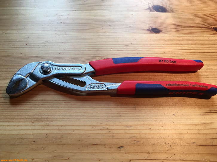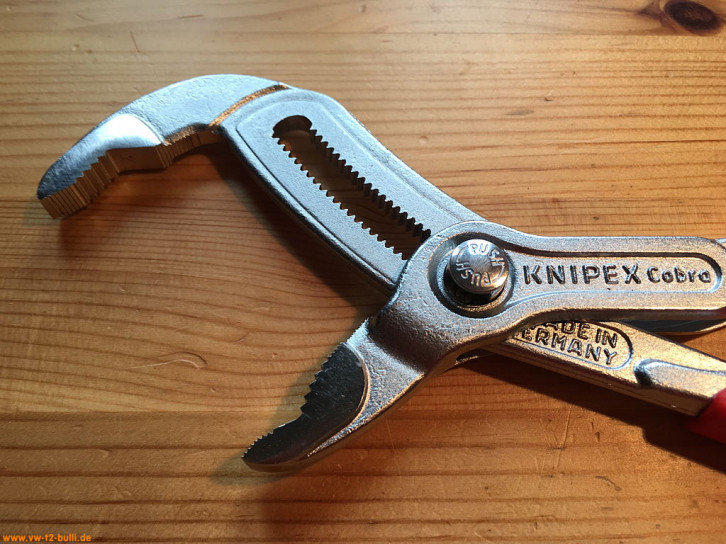 Hochwertige, 250 mm lange Wasserpumpenzange für grobe Arbeiten auch am Bulli. Die Maulweite lässt sich schnell per Knopfdruck einstellen - leichter und schneller als bei den Oldschool Rohrzangen mit Schraubverstellung und mangelndem Klemmschutz.