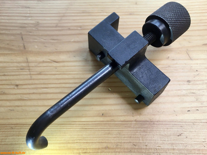 Diese kleine Schaltlehre zur Einstellung des Schaltgestänges (Aufnahme des Schalthebels) hat einen knapp 100 mm langen, schiebbaren Haken mit Stellschraube in einem Kunststoffblock mit Passstiften.