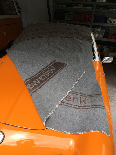 Wolldecke ca. 130 x 180 cm mit eigewebtem "Volkswagen" Schriftzug.