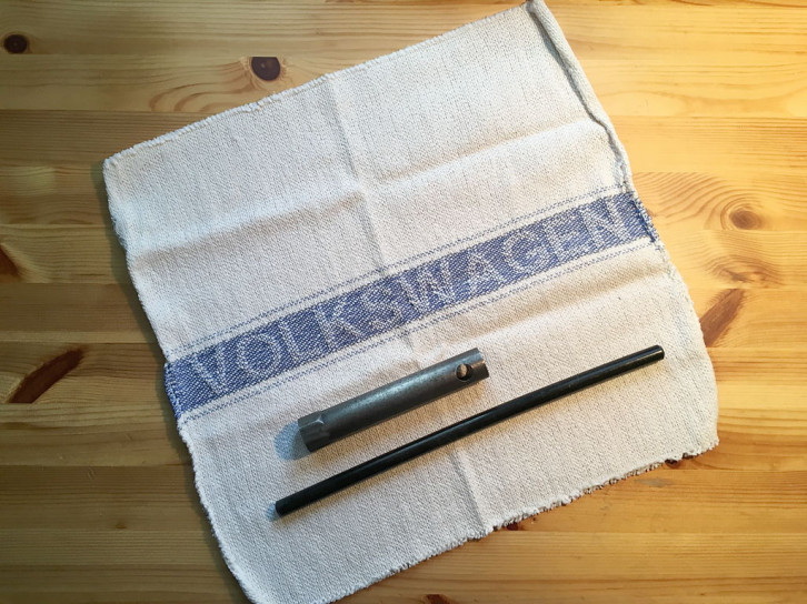 Gab es wenn dann wohl original nur weit vor dem T2 in den frühen 50er Jahren für Käfer & Co Bordwerkzeug. Dies ist nur ein hübsches, noch ölfreies Repro. Eher für Dekoration und Klapperschutz in der Werkzeugtasche.