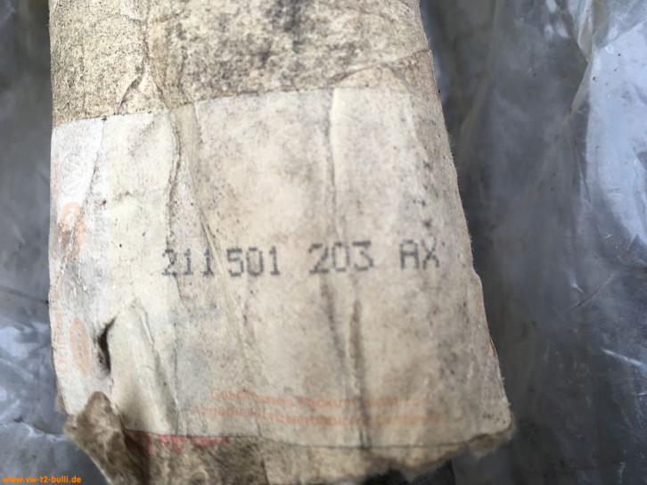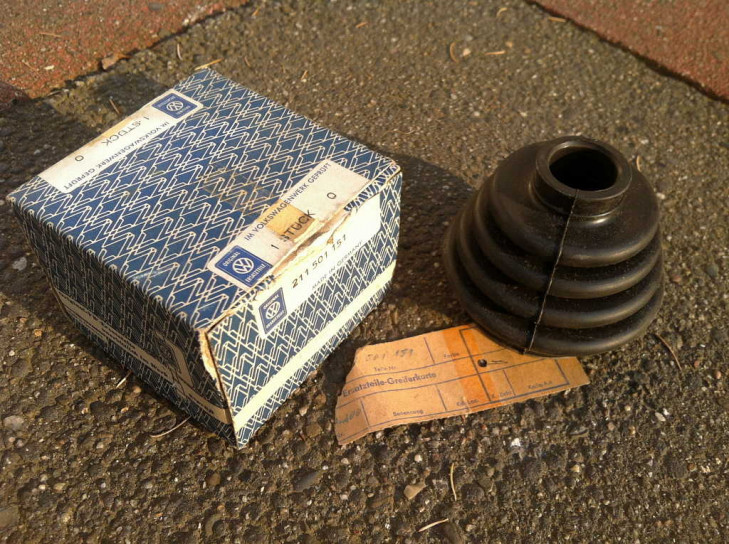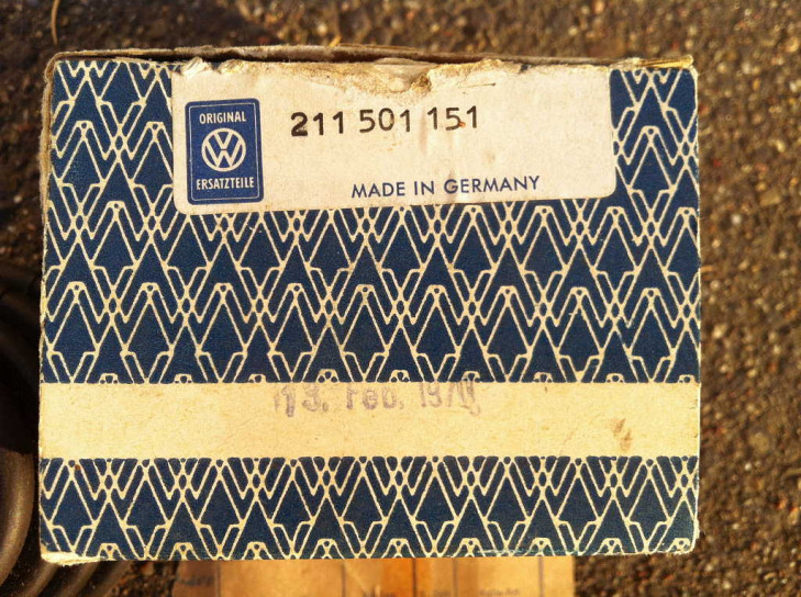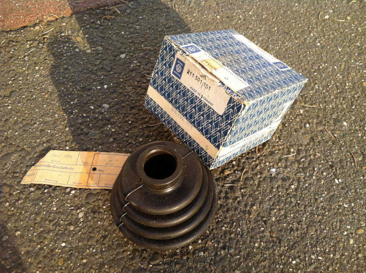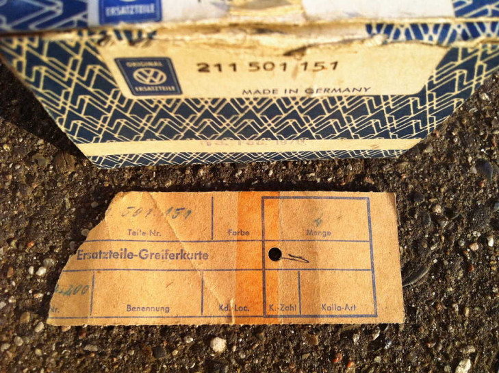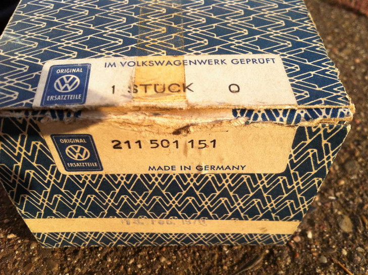 Original VW NOS Ersatzteil vom 19. Februar 1970, Das VW Zeichen und die Teilenummer 211 501 151 steht auch auf dem Manschette - und ein rundes Symbol ähnlichen einen Mond im Kreis mit nachstehender Zahl "13". Auf der Packung steht "Made in Germany".