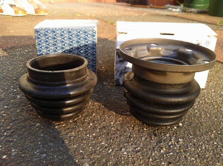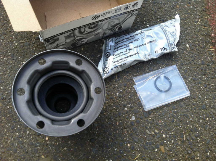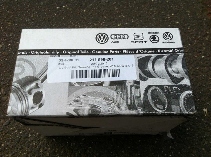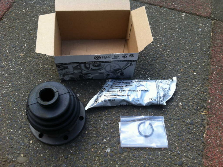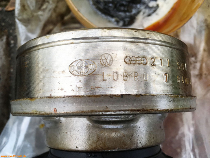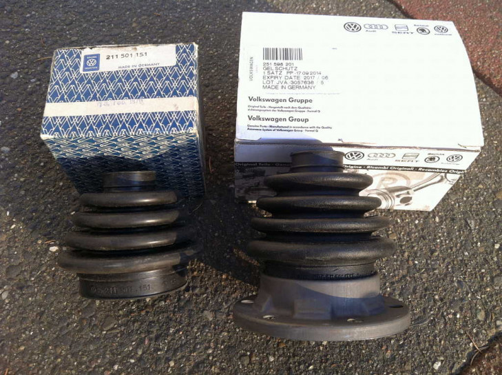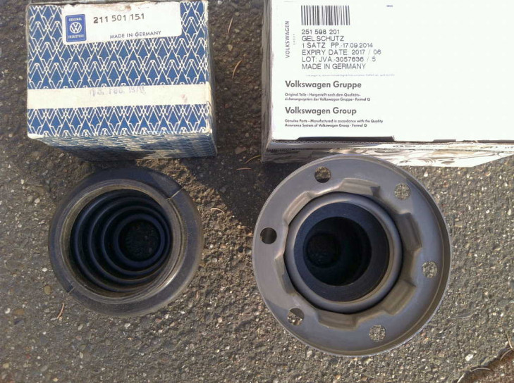 Auf der VW (+ Audi+ Seat + Skoda...) Verpackung steht die Bestellnummer 251 598 201, auf der Manschette am Rand unter der Metallfassung steht 211 501 151 B. Im Set enthalten sind der Sprengring und ein Satz Mehrzahnschrauben samt Unterlegscheiben. Der Metallring und Unterlegscheiben sind scheinbar schwarz chromatiert. Das Hochtemperaturfett scheint abgelaufen und entfernt worden zu sein.