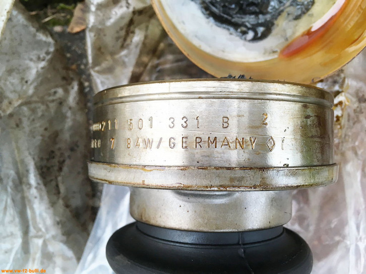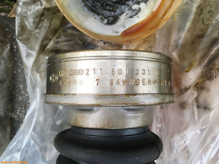 Original VW NOS Antriebswellen für Automatik T2 mit VW Ersatzteilnummer 211 501 203 AX aus den 80ern. Das VW Zeichen und die Teilenummer 211 501 151 B steht auf der Manschette am Rand unter der Metallfassung - und ein rundes Symbol mit Zahl "85". Auf den Manschetten und Achsgelenken steht "Germany".