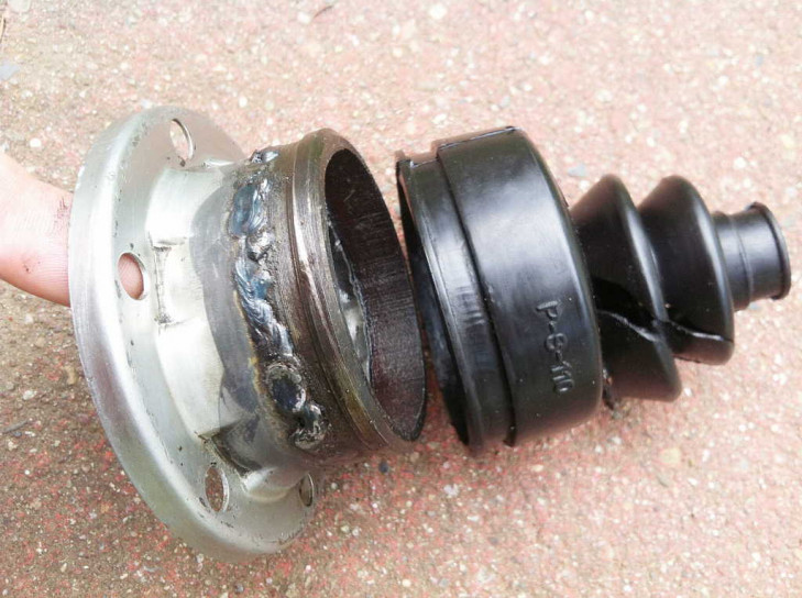 Auf Reisen versagte mir eine Achsmanschette zuviel und das iranische Improvisationstalent half eine No-Name Manschette an einen gebrauchten Ring anzubringen, in dem ein Ring mit einer Nut aufgeschweißt wurde, wodurch die grob passende Manschette sich mit Standard-Schellen befestigen ließ. Das hielt zumindest die staubigsten Teil der Rückreise so ca. 2500 km, danach löste sich die Manschette fetzenweise auf... aber wir sind damit noch bis nach Hause gekommen - ca. 5600 km - und das Lager hatte noch gut Fett und sah auf den ersten Blick in Ordnung aus, gereinigt sah man dann aber Spuren im Metall.