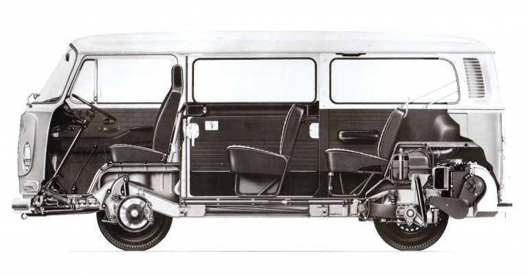 Ein anderer wesentlicher Sicherheitsfaktor ist seine Achslastverteilung. Der Motor belastet die Hinterachse, Fahrer und Beifahrer sitzen über der Vorderachse. Dazwischen liegt der Fahrgast- bzw. Laderaum. Der VW-Transporter fährt deshalb beladen wie leer mit günstigem Achslastverhältnis."