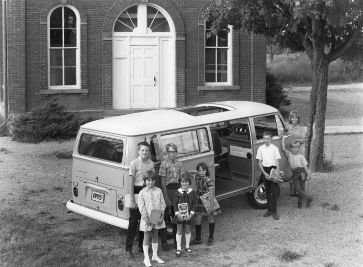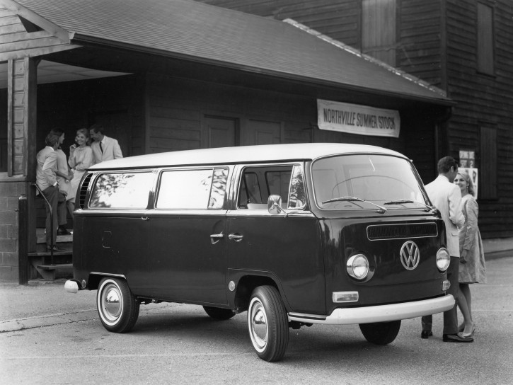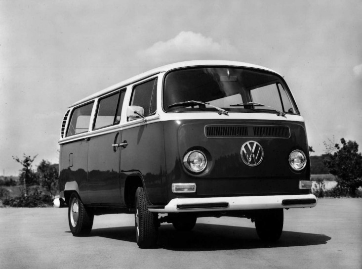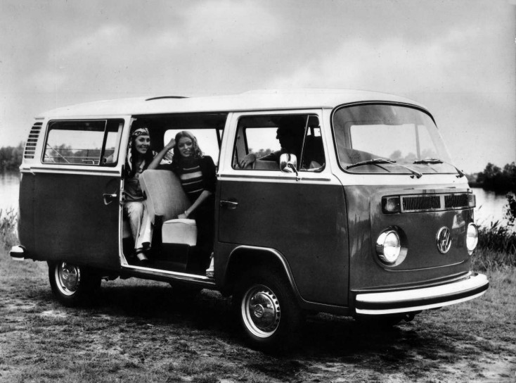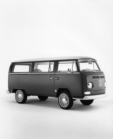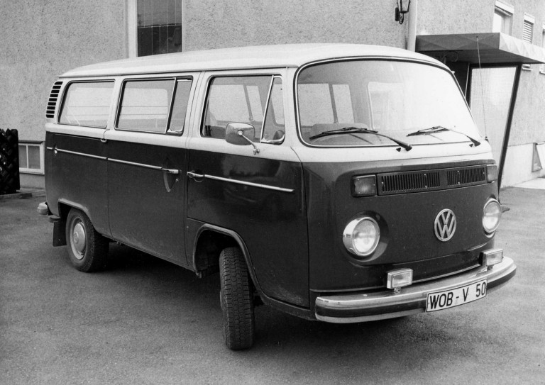 "VW-Bus Jahrgang 1974 mit 1,8 L Heckmotor 68 PS und Vollautomatik. Der 4,5 m lange "Großraum-PKW" kann neun Personen befördern, erreicht eine V-max. von 122 km/h und verbraucht knapp 14 Liter Normalkraftstoff."