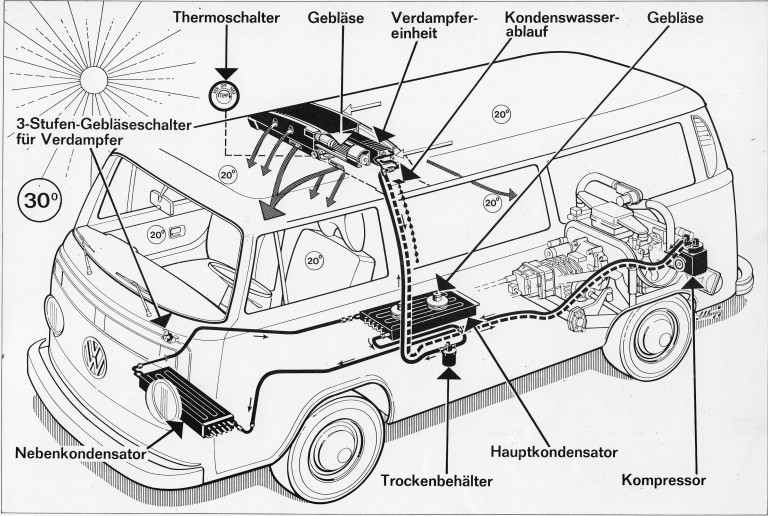Links im Bild wird durch den Automotor der Kompressor angetrieben. Er verdichtet den Kühlmittel-Dampf, der von der Verdampfereinheit kommt (gerasterte Leitung) und schickt ihn unter hohem Druck (durchgehende Linie) zu den Kondensatoren (Verflüssigern). Hier wird dem Kühlmittel in einem System von Rohren und Kühlrippen die Wärme entzogen, die durch die Verdichtung entstanden ist. Das Kühlmittel geht dabei wieder in den flüssigen Zustand über. Ein Thermo-Expansionsventil am Eingang zur Verdampfereinheit ist die Scheide zwischen dem Hochdruck- und dem Niederdruckteil der gesamten Anlage. Es drosselt und regelt den Zufluß des komprimierten Kühlmittels zum Verdampfer, wo es entspannter und deshalb im Temperaturgefälle, unter allmählicher Umwandlung zu Dampf, seine kühlende Wirkung tut: Kühlschlangen und Kühlrippen bieten die notwendige Oberfläche, um daran mittels Gebläsen eine wohltuende linde Brise - bei geschlossenen Fenstern natürlich - im Fahrgastraum zu entfachen."
