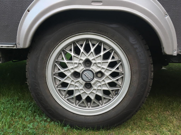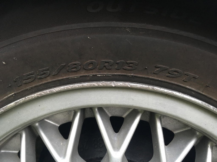 Als Reifen sind montiert Hankook 155/80 R13 79T - passend zu den Originalpapieren (da steht nur Speedindex J - d.h. bis 100km/h, statt überdimensioniertem T bis 190km/h).