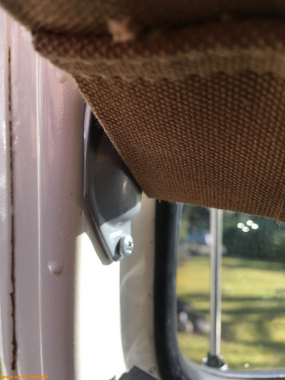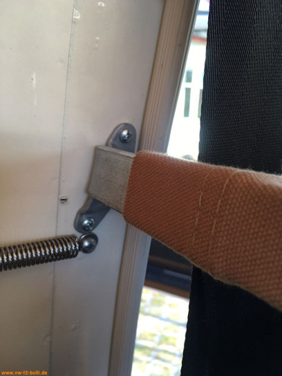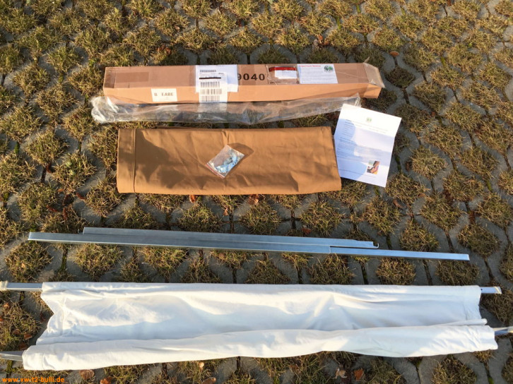 Der braune Stoff des Repros ist recht dick und fest. Für die erste Montage brauche ich zum Spannen einen Stück Holz als Hebel. Die Stangenenden habe ich auch noch mal entgratet, abgerundet und damit leichter montierbar aber auch kindersicherer gestaltet. Ansonsten alles an Teilen dabei inklusive der Schrauben und Haltemetalllaschen an den A- und B-Säulen. Die Maßangaben aus der Westfalia Anleitung fehlen aber leider.
