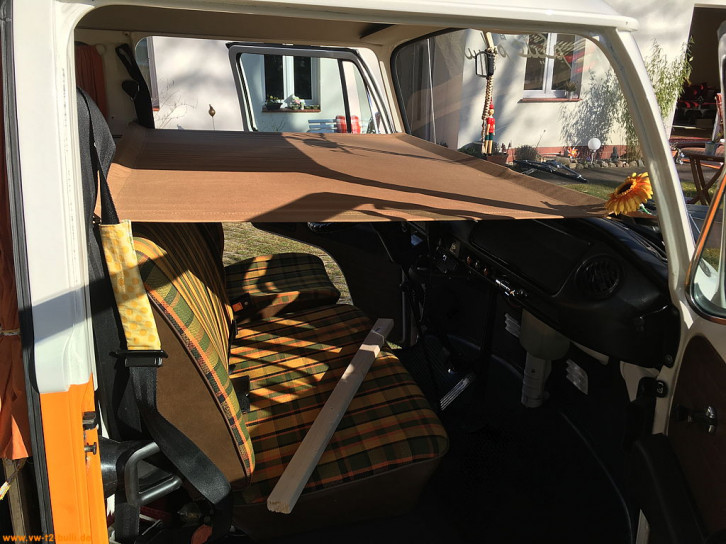 Viele originale mit ihrem hellbeigen Leinen sind nicht mehr im guten Zustand. Die zusammenschiebbaren nur selten oder teuer aus Übersee zu haben. Bei deutschen Händlern war kein Repro derzeit zu bekommen. Aber beim englischen Händler nlavw.com als "Adjustable Child Cab Bunk for VW T2 Bay Window".