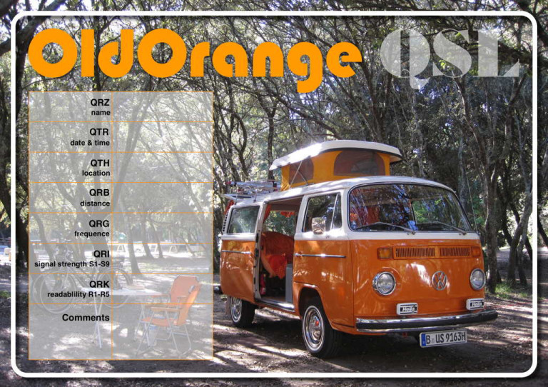 (CQ = Come Quick = bitte kommen, OldOrange = mein Funkname, QRV = auf Empfang).