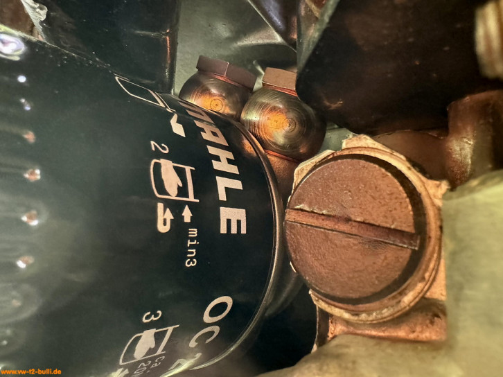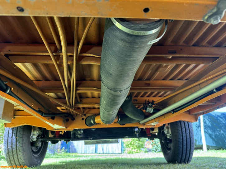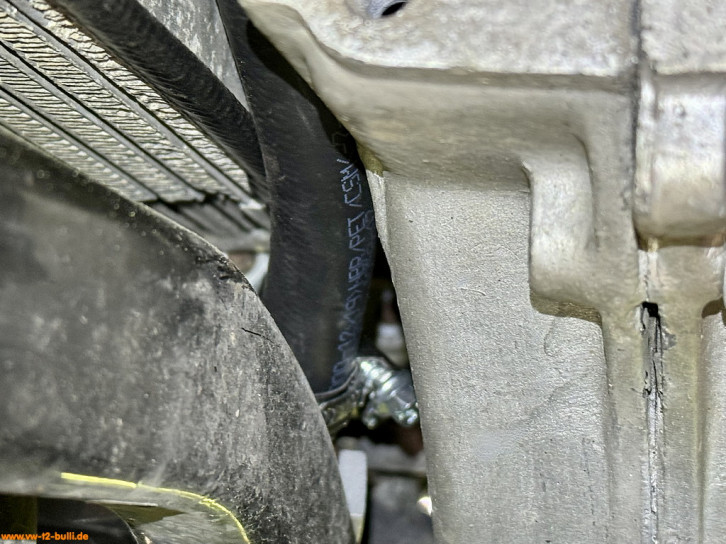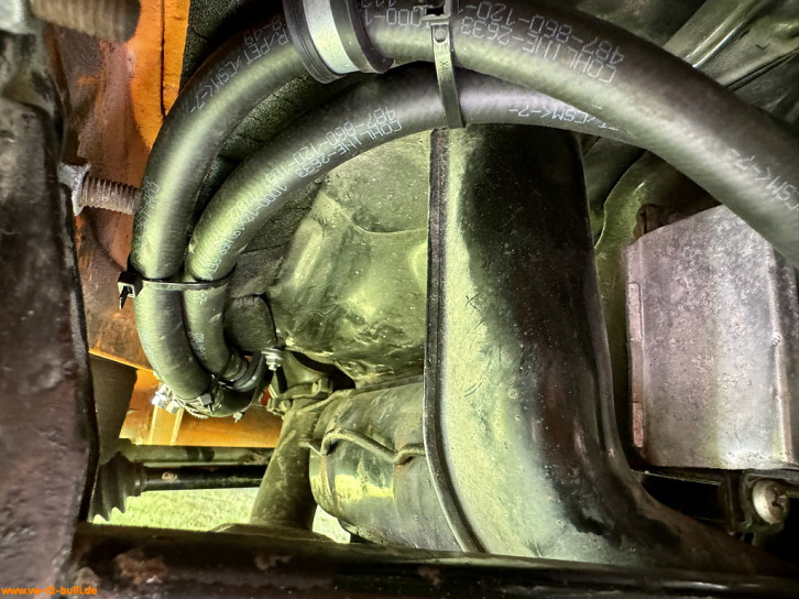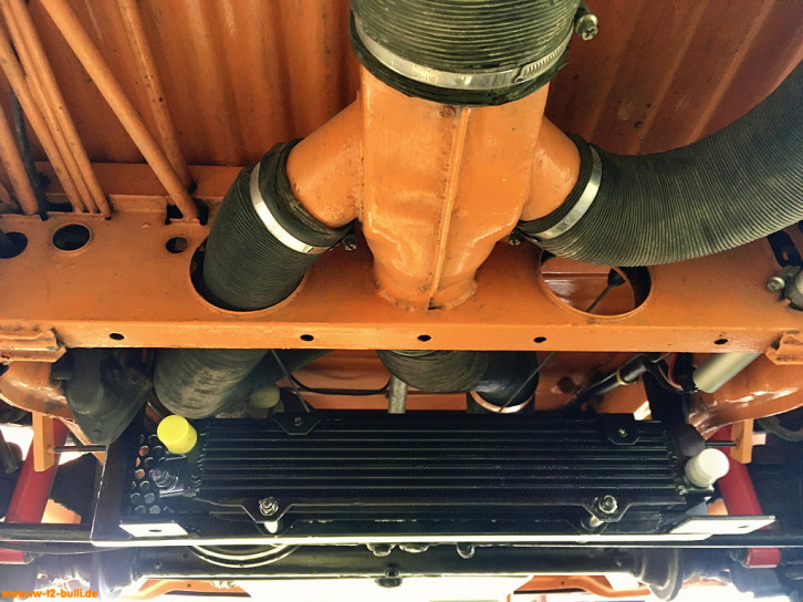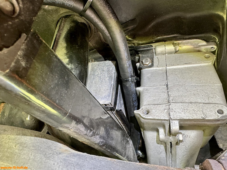 Der Edelstahl-Halter hinter der Vorderachse stammt dankenswerterweise von Matthias S. aus dem Forum der IG T2 e.V. (forum.bulli.org).