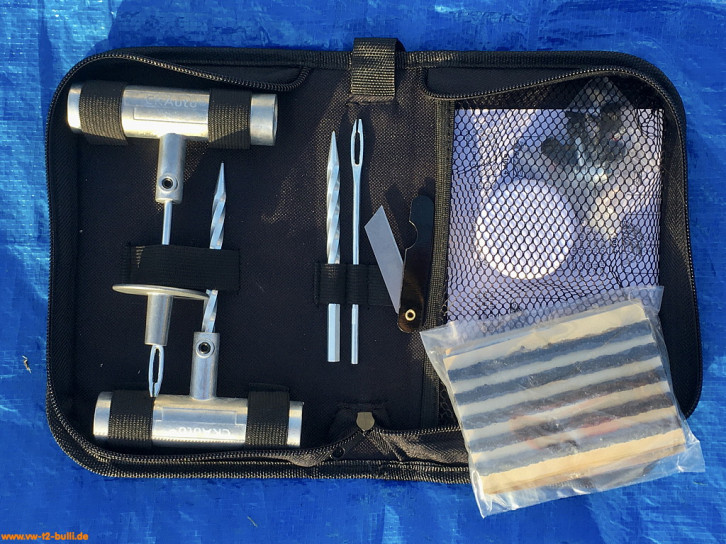 - Reifenreparatur-Kit für Nägel/Dornen samt Ahlen und Dichtzeug,