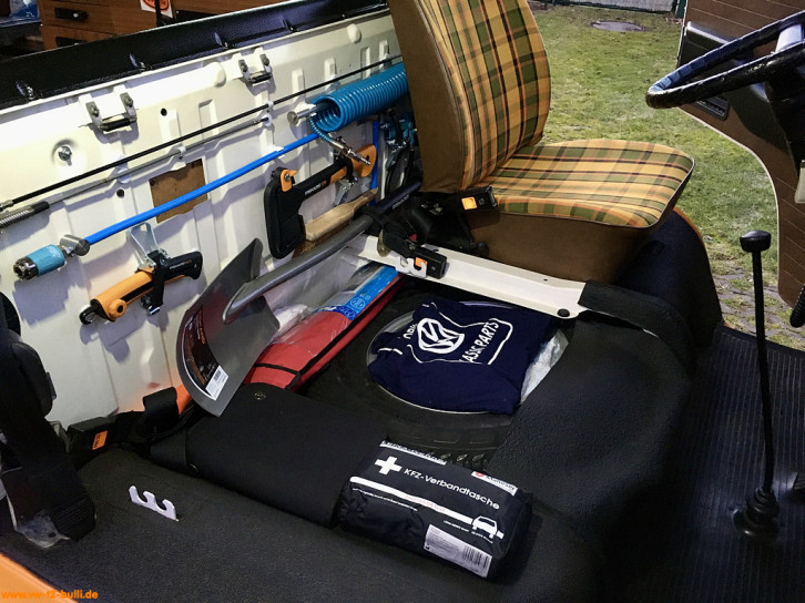 Natürlich sind auch Werkzeugkoffer, Ersatzteile, Plane, Unterlagen, genug Öl und immer eine Rolle Gaffer Tape dabei... ;-)