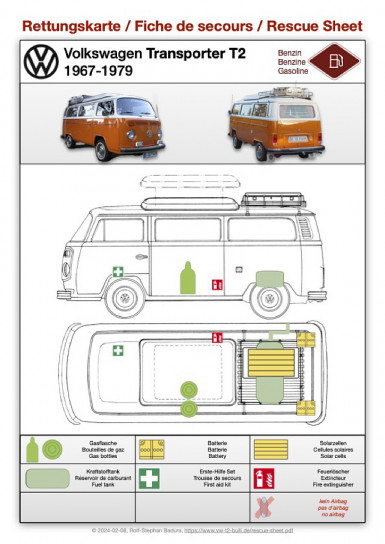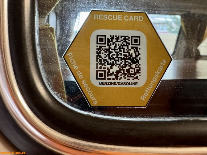 Um Rettungskräften die Arbeit zu erleichtern gibt es rund um den Bulli ein paar Aufkleber mit QR-Code Weblink zur Rettungskarte, wo sind welche Gefahrenquellen z.B. Gasflaschen oder Tank.