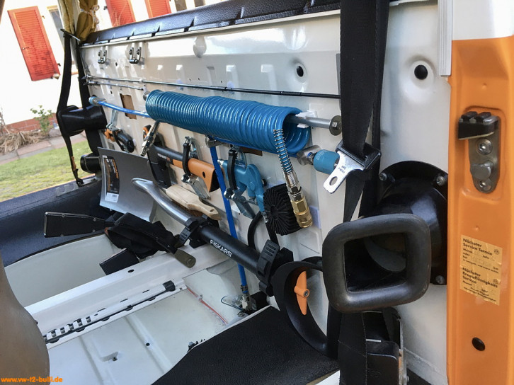 Werkzeuge an der Rückseite der Vordersitze von oben nach unten: