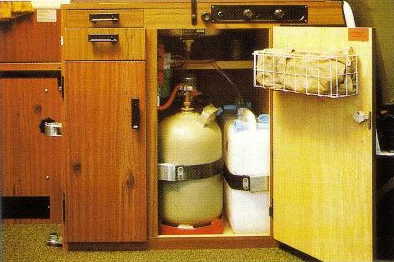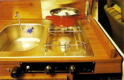 6 Kücheneinheit mit Spülbecken, 2 flammigen Gaskocher, Schubkästen, Wassertanks