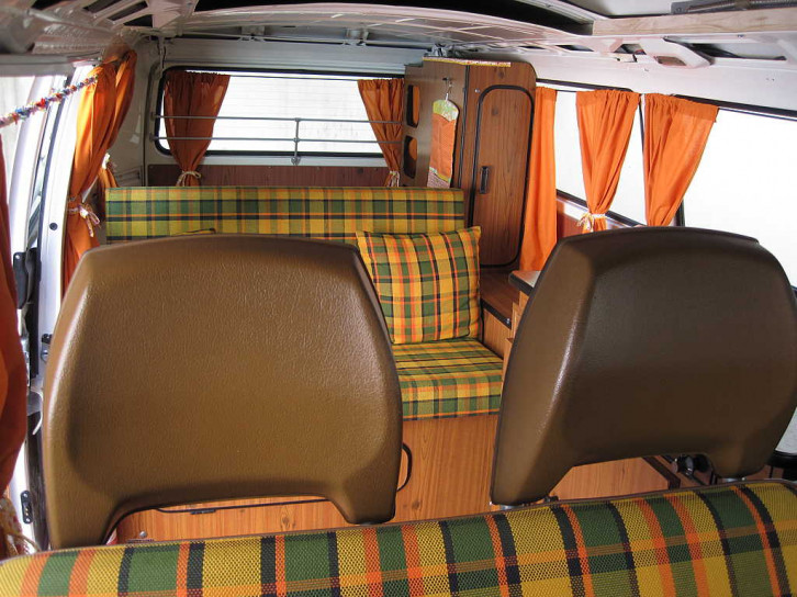 Die Kissen im Westfalia-Look auf den Bildern gibt es bei Teilehändlern. Ebenso wie den Bezugsstoff.