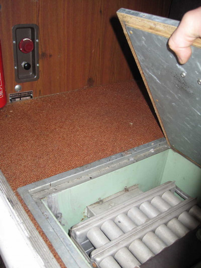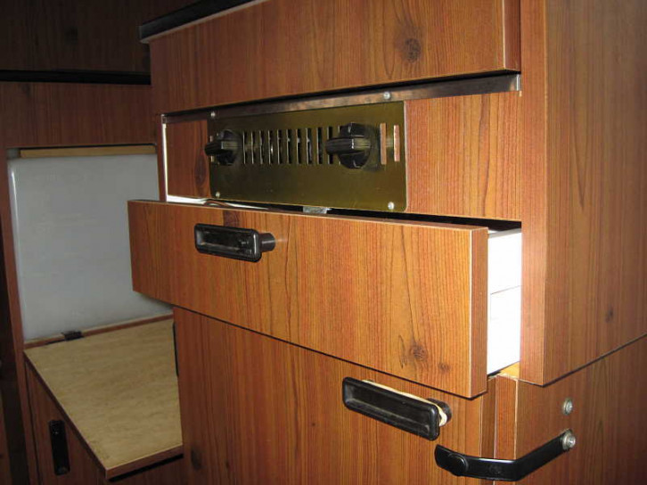 Unter der Bodenklappe nahe der Schiebetür findet sich eine Unterflur-Standheizung ebenfalls markant aus dem Unterboden herausragend. Das Bedienteil findet sich an der Wand der Klappbank.