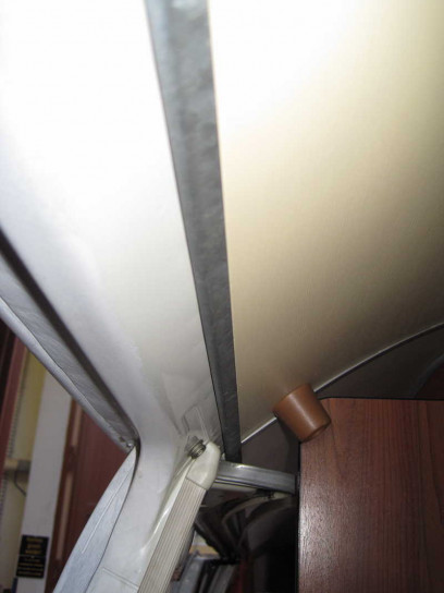 Im Küchenteil an der Schiebetür findet sich ein Kühlschrank und oben eine Gasherd. Der Kühlschrank hat für den Gasbetrieb eine Abluftrohr zur B-Säule auf der Fahrerseite. Die Klappe auf dem Gasherd wird etwas angehoben, leicht zur Fahrzeugmitte geschoben, aufgeklappt und wieder zur Fahrzeugaussenseite geschoben.