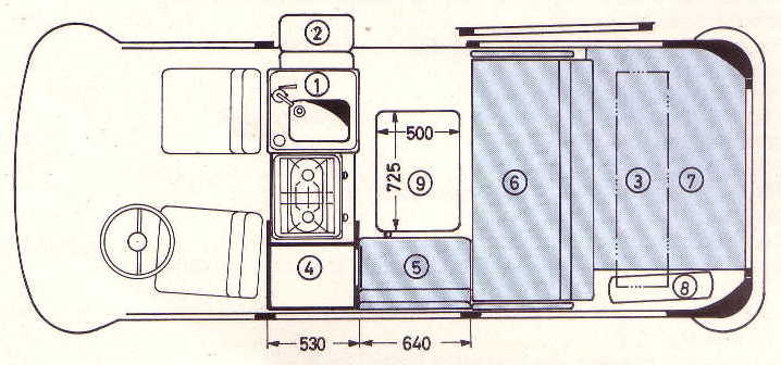 Westfalia "P-35"Ausstattungsvariante um Modelljahr 1975 - gefunden in einem französischem Prospekt. Die Ausstattung ist ähnlich einer SO 72/3 Helsinki. Unterschiede bisher unklar. Grundriss Tag & NachtProspekte