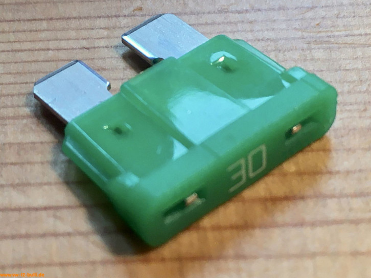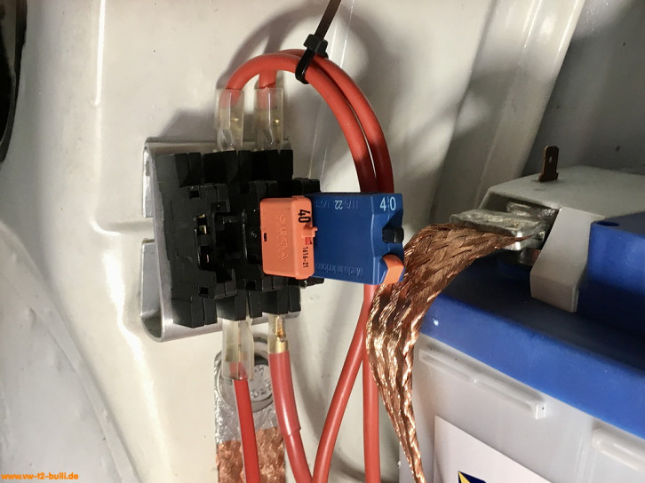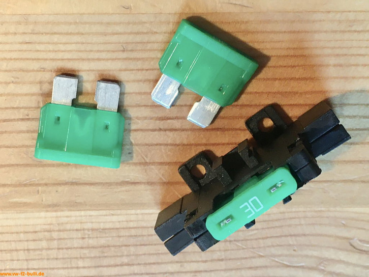 Die Leitungen zwischen den Batterien sollten mit ca. 30 A abgesichert werden. Die im Bulli üblichen Torpedosicherungen sind zwar auch als 25 A und 40 A verfügbar, aber die knappe Kontaktfläche ist bei solchen Strömen nicht ideal. Daher bin ich auf die üblichen ATO Sicherungen aus modernen KFZ ausgewichen.
