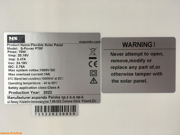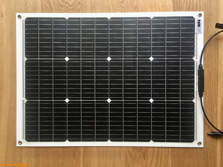 Flexibles sehr flaches Solarpanel (Monokristallin, Schindel-Technologie, auf ETFE Ethylen-Tetrafluorethylen-Kunststoff) mit bis zu 70 Watt mit L/B/H 750/540/20 mm für Temperaturbereich von -40 bis 80 °C, dass auf unserer 120 L Zarges-Box auf dem Dachträger seinen festen Platz findet.