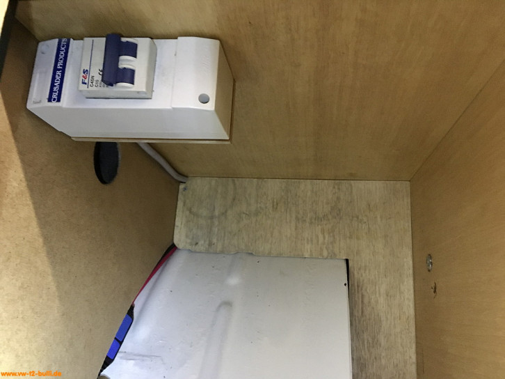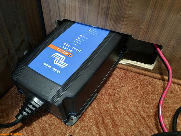Vom Ladegerät sieht man nach Einbau fast nichts. Eingebaut ist es unter der passiven Kühlbox der Westfalia "Berlin" Ausstattung. Dafür musste das kleine Lüftungsgitter entfernt werden und der Ausschnitt etwas vergrößert werden. Am Lüftungsgitter war ein Filz, den ich mit etwas Abstandhaltern wieder anklebte für besseren Abwärmemöglichkeiten bei voller Last. Das Ladegerät schaut dann etwas in den Stauraum dahinter, damit man ein Gehäuseende mit zwei Schrauben im Holzboden festschrauben kann und eine Schraube auf der Gitter Seite - die vierte Schraubmöglichkeit ist nicht erreichbar. Die 230 V Technik findet sich bei mir auch dahinter in den Tiefen des Stauraum unter einem Eigenbaudeckel. Massekontakt ist am Radhaus und der Plus 12 V Ladestrom geht über das Radhaus in den Westfalia "Berlin" Kleiderschrank und dort runter in den Motorraum zu Trennrelais und Solarladetechnik. Sollte trotz begrenztem 10 A Ladestrom die Sicherung eines Campingplatzes überfordert sein, kann ich den Ladestrom trennen mit dem beiliegendem Stecker, den ich erreichbar positioniert habe. Einen extra Schlater habe ich dafür aber nicht vorgesehen, da ich die Batterien immer so voll wie möglich haben möchte bei Landstrom.