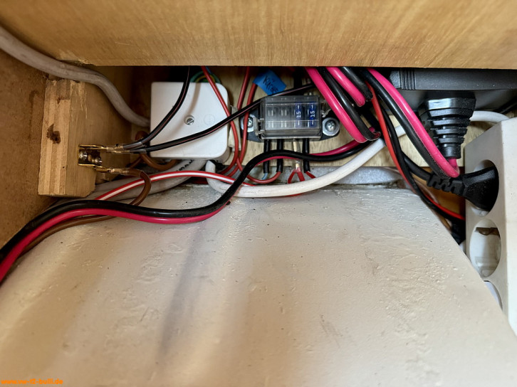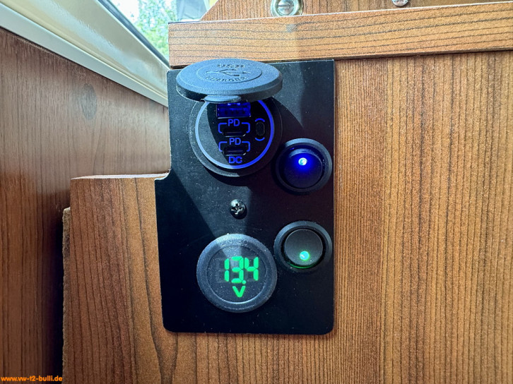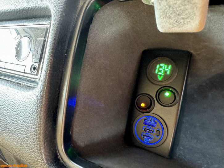 Während der Fahrt und beim Campen braucht man heute USB-C und USB-A Ladepunkte. Im Handschuhfach über Sicherung 9 an Klemme 30 mit Batterie Dauerplus angeschlossen. Im Wohnraum an der hinteren Seite des Küchenblocks an Batterieplus der Zweitbatterie. Zwar haben diese einen Tastschalter zum Ein-/Ausschalten, brauchen dann aber ausgeschaltet immer noch einen kleinen Strom zur Überwachung des Tastschalters. Um diesen zu vermeiden ist ein einfacher beleuchteter Kippschalter verbaut. Um eine Idee über Ladestand und Ladespannungen zu haben, ist noch eine Voltanzeige verbaut. Ebenfalls mit Kippschalter, damit sie nicht die ganze Zeit Strom benötigen.