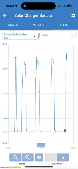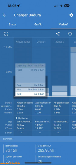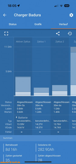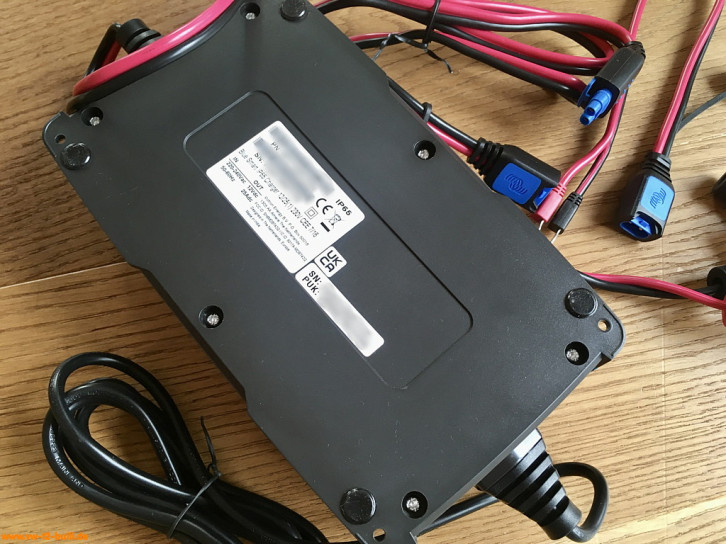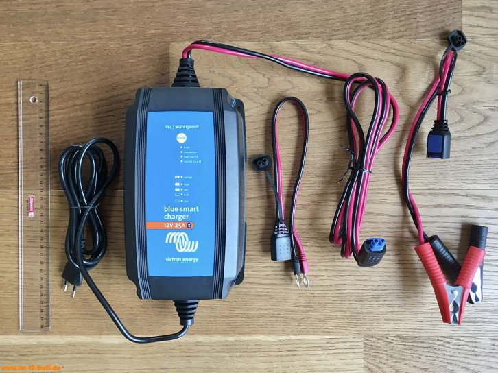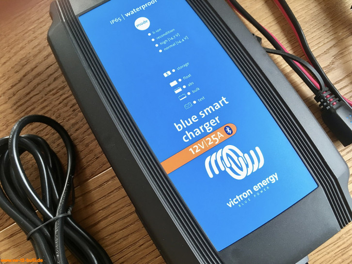 Das Batterie-Setup (70 Ah + 95 Ah EFB) kann mit 16,5 A ~ 240 W (bis max 41,25 A ~ 600 W) geladen werden, dazu passt diese 25 A Version, ohne Grenzbereich nutzen zu wollen und bei uns meist nur 10 A genutzt werden um auch bei manchem Campingplatz nicht die Sicherungen auszulösen. Das dafür nötige Ladegerät ist dann aber auch von Formfaktor schon etwas größer mit L/B/H 240/140/75 mm - aber ohne Lüfterlärm wie manch anderes. Neben LEDs besitzt es Bluetooth zum Einstellen und zur Überwachung per Smartphone.