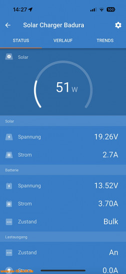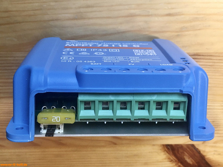 Solar-Ladegerät für 12V/24V Batterien und dabei einstellbar ob z.B. standard Blei-Säure oder Lithium. Mit Anschluß für Solar-Module bis 220W (bei 12V) und max. 75V PV-Leerspannung. Darüberhinaus besitzt er ein Lastausgang mit Spannungswächter zur Vermeidung von Tiefentladung der Batterie (z.B. Trennung bei 11,1 V). Neben LEDs besitzt er Bluetooth zum Einstellen und zur Überwachung per Smartphone. Eigenverbrauch ist 25 mA.