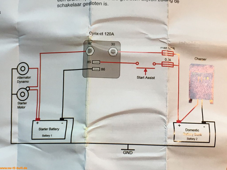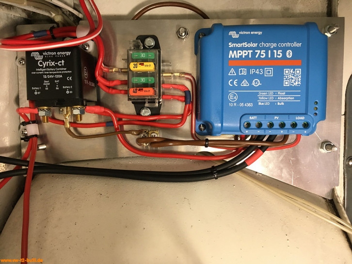 Eingebaut ist es bei mit mit Solarladeregler und Sicherungen im Motorraum auf der Fahrerseite neben dem Tankschott. Eine 6 qmm Leitung geht rüber zur Starterbatterie - durch 40 A Sicherungen geschützt. Ein kurzes zur Zweitbatterie. Solarladeregler und 230 V Ladegerät sind auch damit verbunden. Den Startassist-Eingang zum manuellen Zusammenschalten beider Batterien nutze ich derzeit nicht, noch in der Hoffnung, dass ich ihn nie brauchen werde.