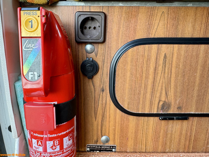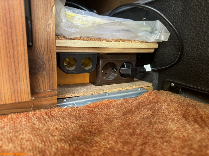 Nahe Schiebetür ist manchmal auch noch ein Anschluß nötig. Wir haben in der Schlafbank dort eine typische 12 V Zigarettenanzünderbuchse und eine 230 V Steckdose bei Landstrom.