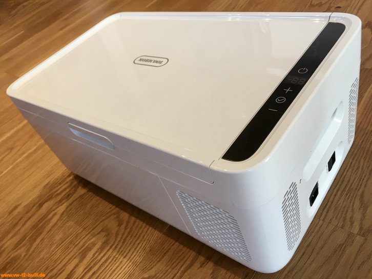 Neuzugang ist eine kleine Kompressor-Kühlbox mit 15 L Fassungsvermögen mit –18 bis +20 °C für 12 V (bzw. 24 V) Gleichstrom oder 100-230 V Wechselstrom, bei Energieklasse B (A-G), den Maßen H/B/L 261/344/587 mm, 9,5 kg und erträglicher max. Lautstärke von 47dB(a). Er schaltet sich nur gelegentlich alle paar Minuten ein, kühlt dann kurz wieder runter aber läuft nicht die ganze Zeit. Mit Tiefentladungsschutz der Fahrzeugbatterie bzw. Ausschaltspannung bei 11 V und Wiedereinschaltspannung bei 12 V.