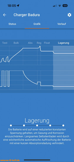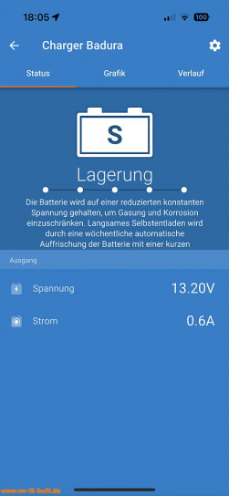 - Lagerungsspannung: 13,2 V (laut Victron-MultiPlus II Anleitung für Bleibatterien)