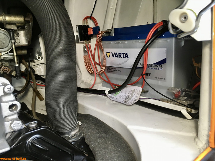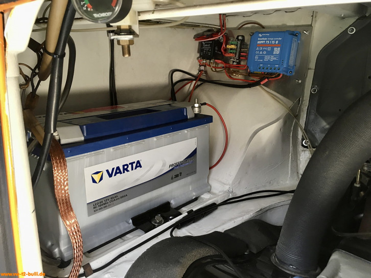 Eingebaut ist es bei mit mit Batteriekoppler-Relais und Sicherungen im Motorraum auf der Fahrerseite neben dem Tankschott. Der mit Spannungswächter ausgestattete Plus Lastausgang geht dann per Kabel hoch in den Kleiderschrank und von dort in meine Elektiktechnikecke in das Staufach hinter der Kühlbox der Westfalia "Berlin" Ausstattung. Von dort dann Weiterverteilt an Verbraucher und 12 V und USB Steckdosen.