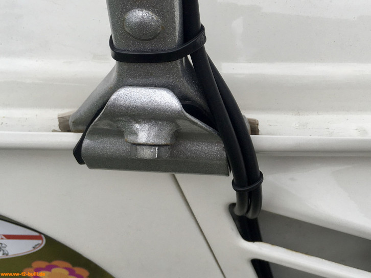 Die Kabelführung geht über die Klappschanierseite der Zargen-Box am Dachträger zur Fahrerseite und dort über das Lüftungsgitter runter zum Motorraum an den Solarladeregler.
