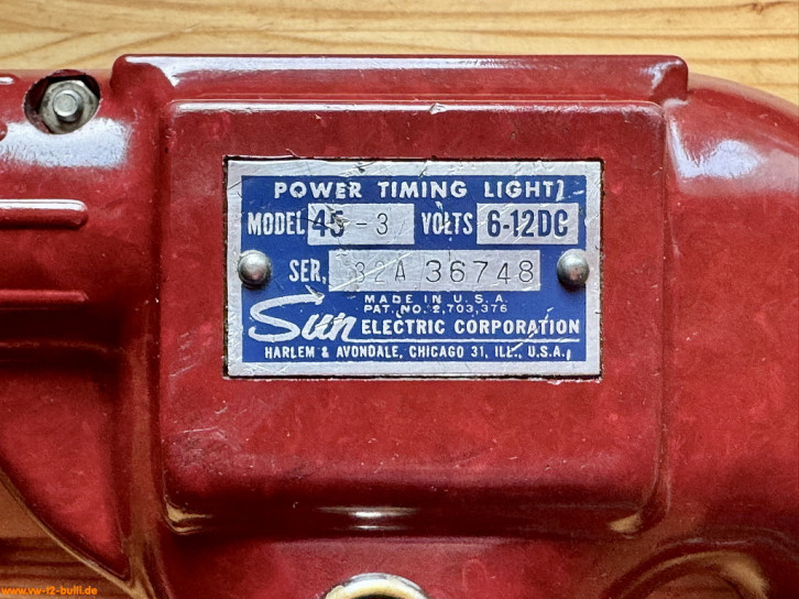 Laut Sun Prospekt 1961: "Der Sun PTL-45 gilt seit langem als die zuverlässigste, mit Gleichstrom betriebene Zündzeitpunktleuchte auf dem Markt. Leistungstests haben gezeigt, dass diese Leuchte über 14 Millionen aufeinanderfolgende Zündungen ohne Anzeichen von Ausfall oder Störung lieferte. Die automatische Spannungswahl ermöglicht den Betrieb der Leuchte mit 6 oder 12 Volt, und ihr blau-weißer Strahl beleuchtet die Zündzeitpunktmarkierung sowohl im Außen- als auch im Innenbereich deutlich. Das robuste, stoßfeste Gehäuse aus leuchtend rotem Fiberite ist nahezu unzerstörbar. Die versenkte Lupe ist durch einen flexiblen, fettbeständigen Schutz geschützt.".
