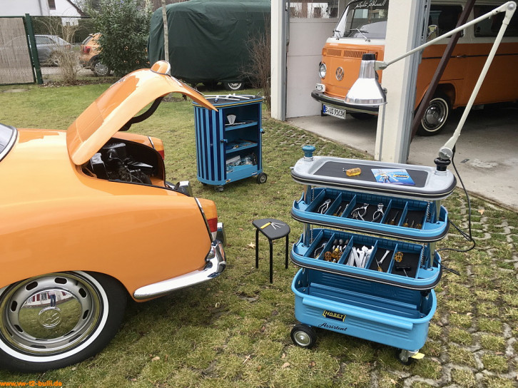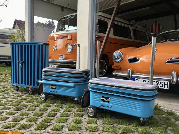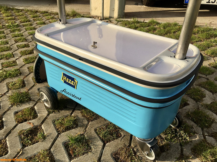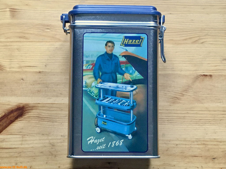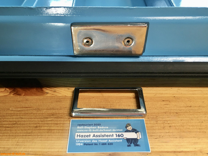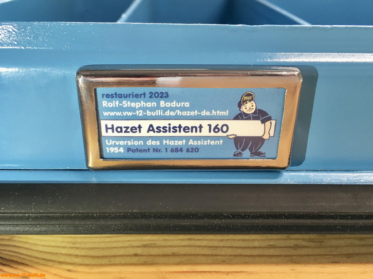 Randbemerkung: ursprünglich stammt er von der Firma HELKA bzw. von HELmut KAatsch, Benratherstraße 15, Solingen-Ohligs. Diese Firma war weniger als 20 km entfernt von HAZET. Dort als "HELKA Favorit" vertrieben und belastbar bis 250 kg, teils in hellblau und gelb mit Schiebetüren aus Resopal (statt aus geformten Blech wie viele und dieser hier) und wechselnd in hellblau und gelb (statt hellblau und dunkelblau), Lammellen innen einfarbig hell (statt wie vorne) und nur mit schmaler Stoffbahn zusammengeklebt (statt durch Blechlaschen und 3 Federdrähte längs zusammengehalten), Zwischenbödenfronten in gelb (statt uni hellblau mit dem Zwischenboden), sonst hellblau, Rollen mit Metallfelgen (statt bei vielen modernere graue Nylonfelgen - nicht allen), an den Lenkrollen großen Bügelbremsen (statt bei vielen kleine Hebel mit Gummitrittschutz) und hinten mit rotem Aufkleber von "Helmut Kaatsch" mit Anschrift und großen "K" im Hintergrund (bei blauen Version sind bisher keine Aufkleber oder Aufschrift bekannt). Es gibt auch ein s/w Bild aus Mitte der 1960er mit 5 dieser hellen (vermutlich hellblau und gelb) Werkstattwagen und VWs in einer Werktstatt. Es sind aber auch ein s/w HELKA Prospekte bekannt mit "Favorit" in "Farbton: Blau - dunkelblau" zu "DM 360.-" (umgerechnet heute ca. 1060 €) und zusätzlichem 73-teiligen "Meister-Werkzeugsatz". Unbekannt ist heute, ob HAZET die Firma aufkaufte für die Assistent Fertigung oder nur dieses Model in seinene Farben weiterverkaufte - oder es immer nur ein HELKA war mit vielleicht teils HAZET Werkzeugen in ähnlicher Farbgebung und es nie ein HAZET Produkt war. Schön, praktisch und nostalgisch ist er trotzdem.