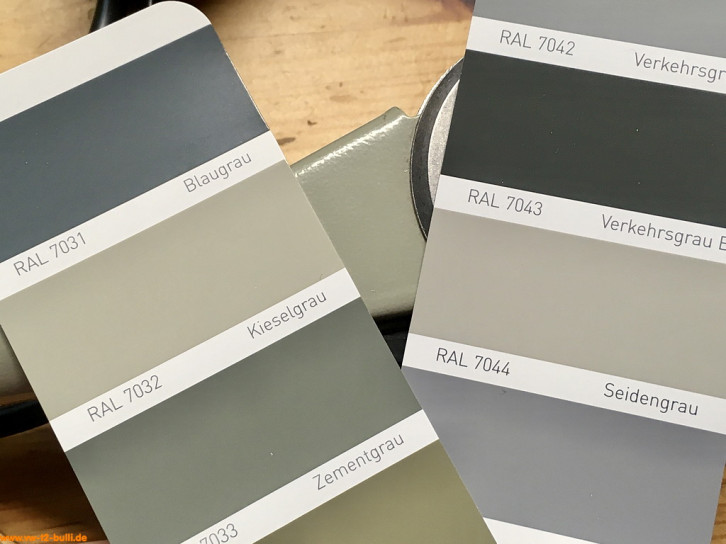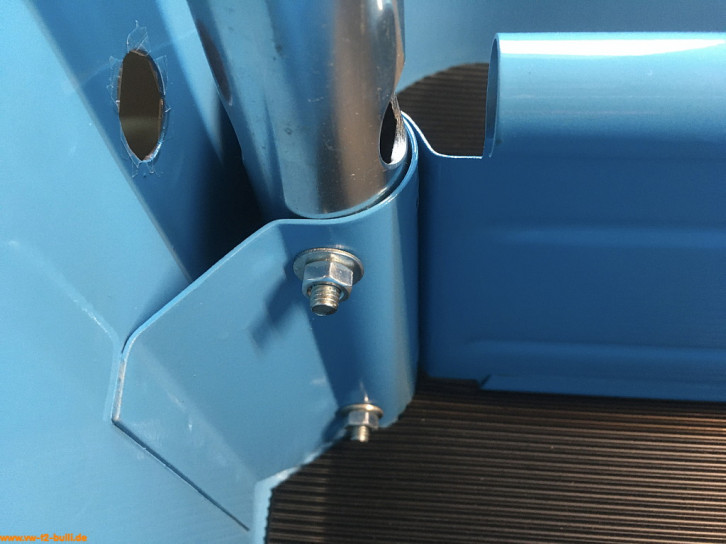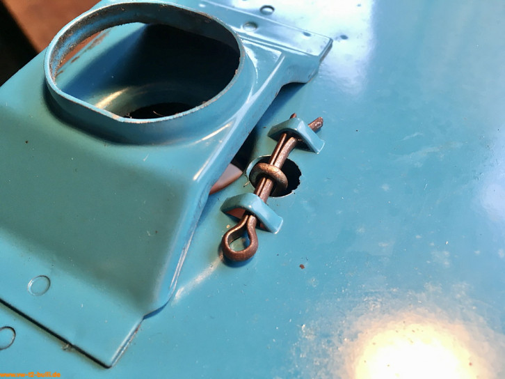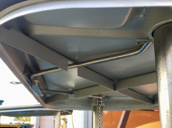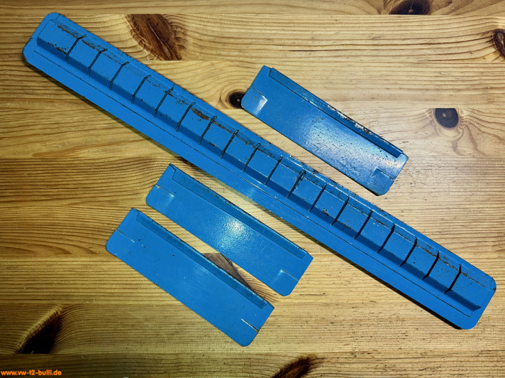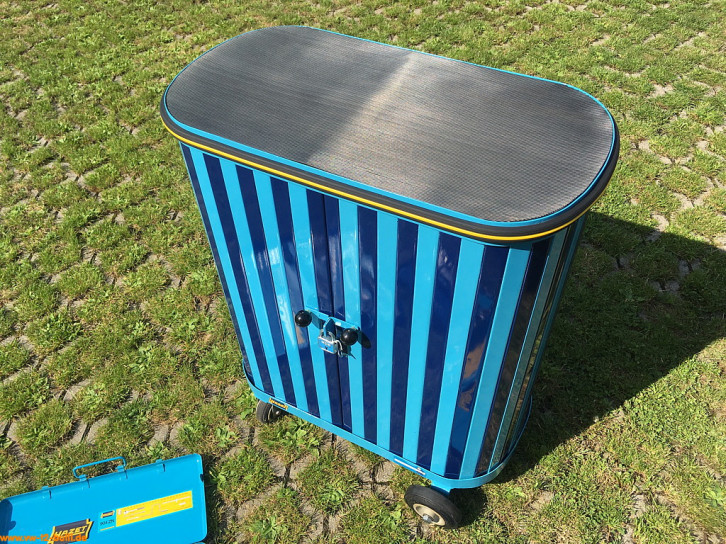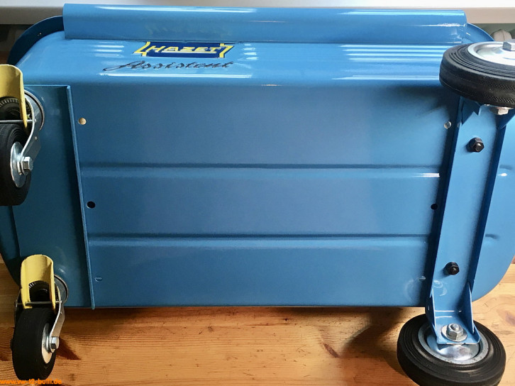 Dieser hier kommt aus der Umgebung von Bielefeld und war mal nachträglich rot gestrichen - die Schiebetür-Lamellen waren aber darunter original abwechselnd hell- und dunkelblau und der Rest hellblau, wie auch innen noch erkennbar. Die Schiebetüren lassen sich hinten herausschieben, wenn man an der unteren Führung zwei Hohlnieten entfernt und jeweils oben vorne und hinten mittig eine Mittenanschlag-Schraube entfernt. Die Lamellen werden innen durch 3 Federdrähte zusammengehalten. Radgrößen sind 125 mm und 80 mm, Felgen aus hellgrauem Nylon. Das Blech zur Verriegelung ist 2 mm stark und habe ich anhand von Fragmenten und Bildern ersetzt, da eine Seite abgebrochen und die andere Seite auch geschwächt war durch Verbiegungen. Für den oberen Kantenschutz passt perfekt ein noch bei HAZET erhältliches 172-Rammschutz-Mittelkasten Set (2,4 m lang mit gelben Keder).